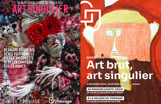 Deux lieux, deux expositions ! A la galerie Le Triphasé : cinq artistes Singuliers : Rebecca Campeau , Didier Hamey, Pierre Amourette, Denis Pouppeville et Bernard Briantais (commissaire d’exposition) Du