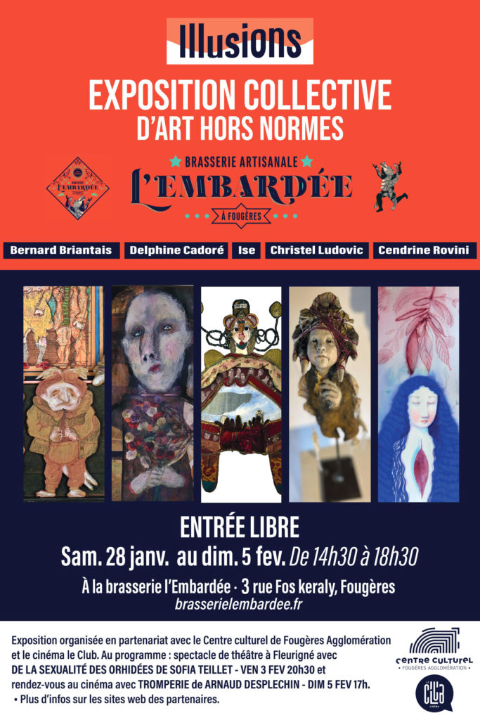 Exposition collective d’Art Hors Normes à la brasserie l’Embardée3 rue Fos Keraly, Fougères Du samedi 28 janvier au dimanche 5 févrierde 14h30 à 18h30