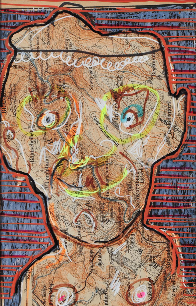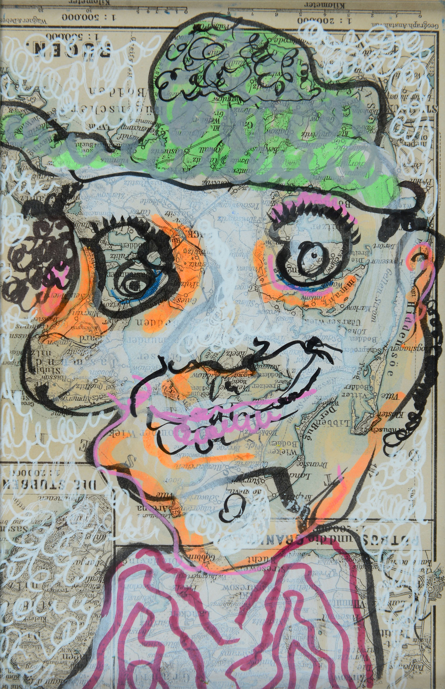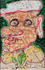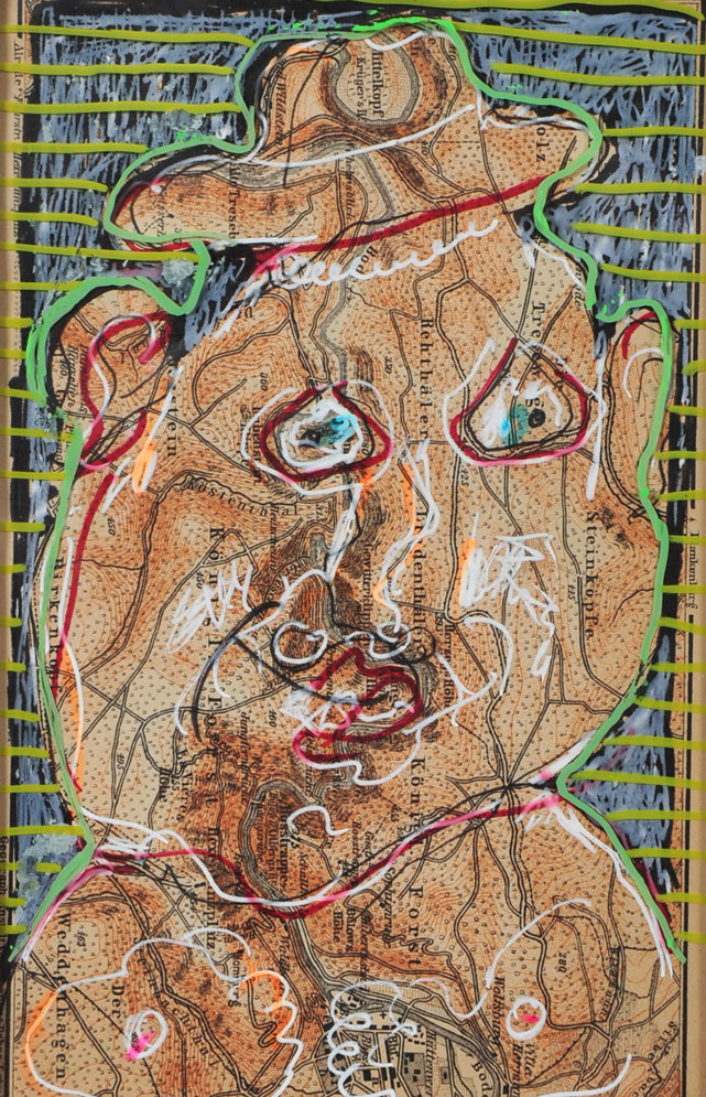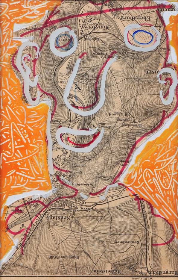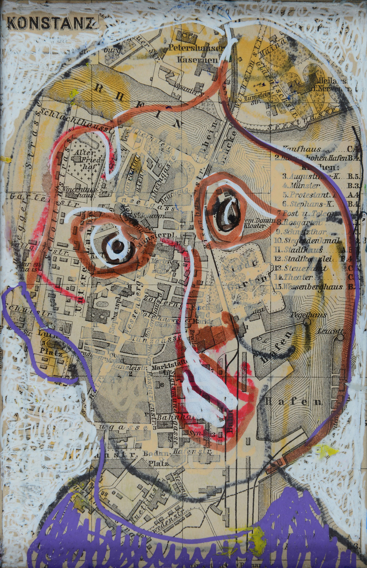 Je récupère de vieux guides Baedeker dont les plans de ville me servent de trame. En suivant des routes imaginaires, mon crayon trace des itinéraires improbables qui finissent par former des visages. Tel Janus, mes créations ont 2 facettes : l’une plus grave et porteuse de questionnements, l’autre plus spontané et ludique avec un zeste d’humour.