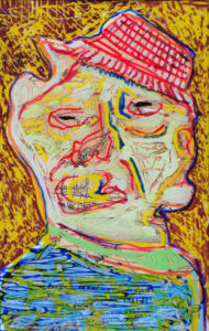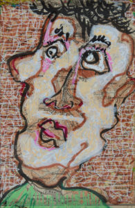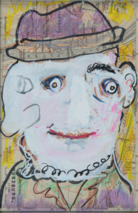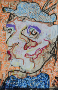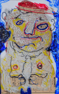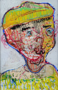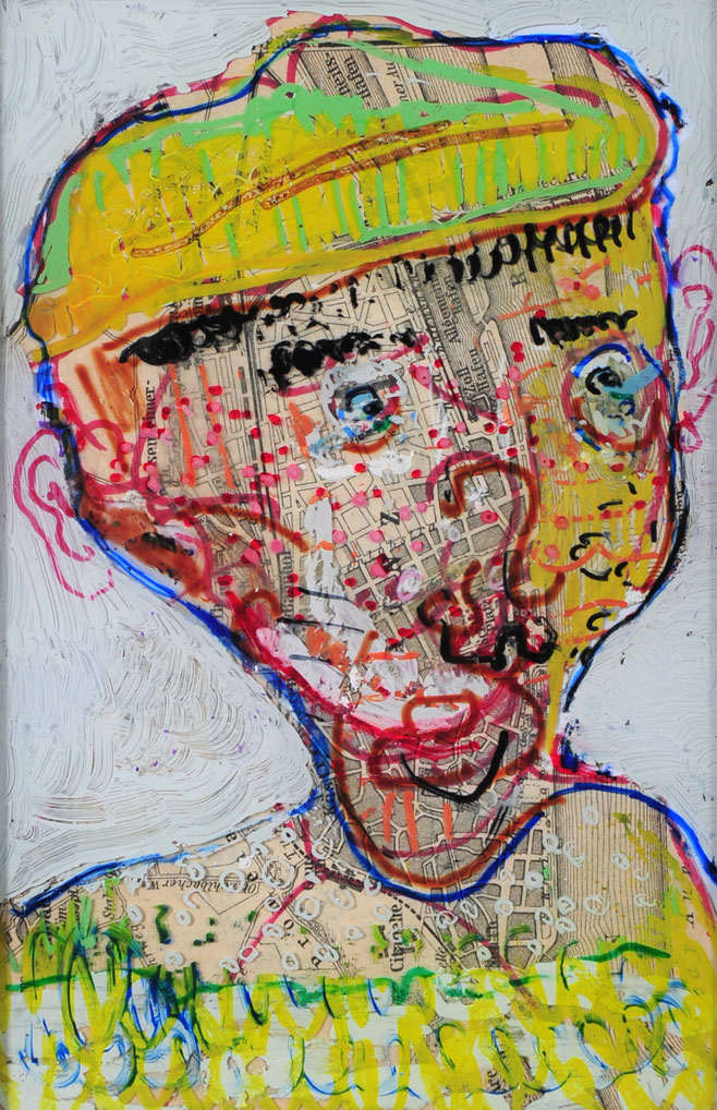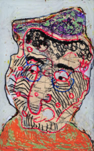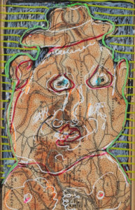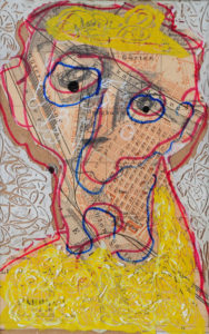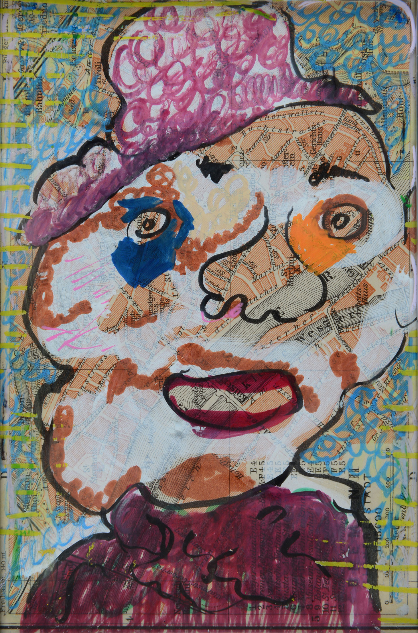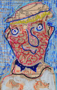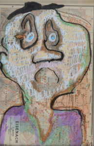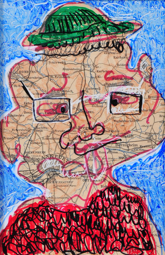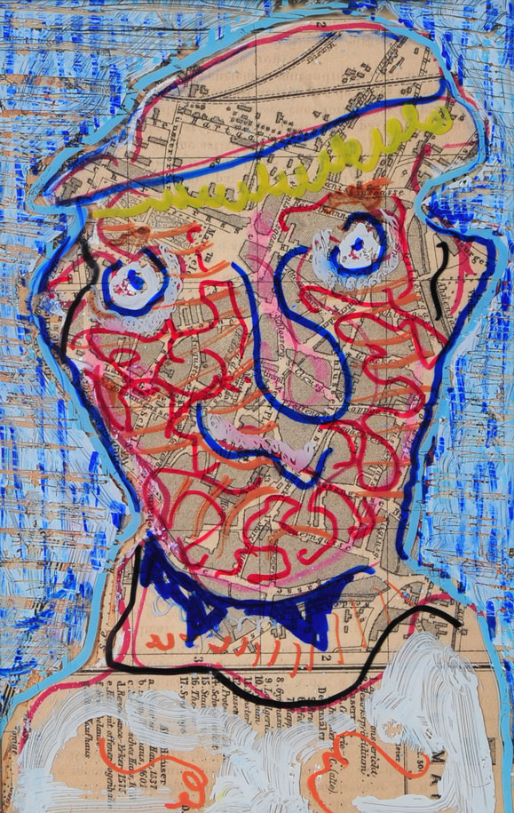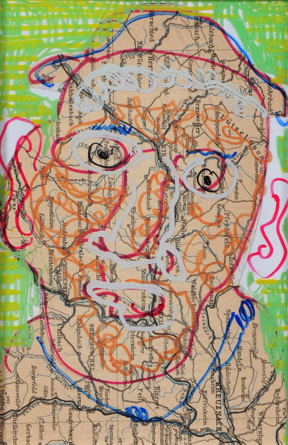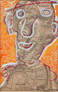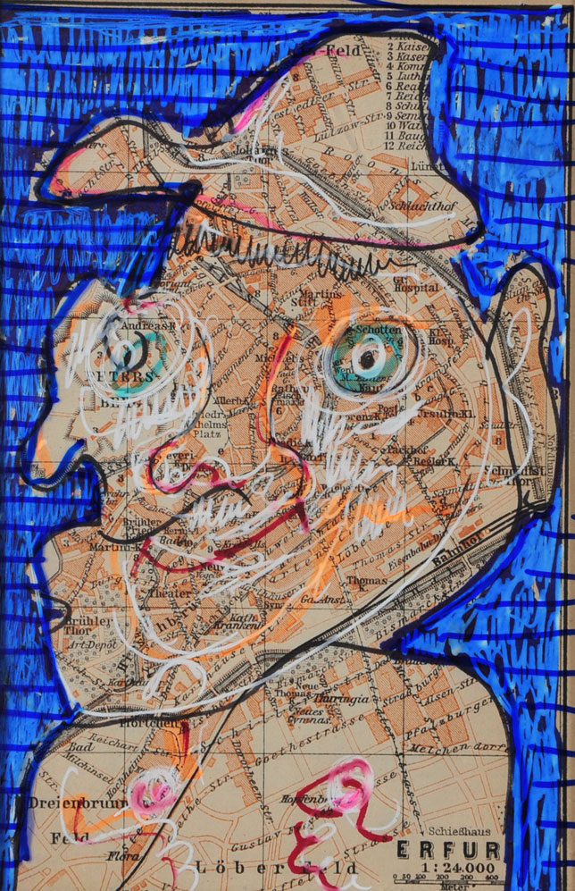 Je récupère de vieux guides Baedeker dont les plans de ville me servent de trame. En suivant des routes imaginaires, mon crayon trace des itinéraires improbables qui finissent par former des visages. Tel Janus, mes créations ont 2 facettes : l’une plus grave et porteuse de questionnements, l’autre plus spontané et ludique avec un zeste d’humour.