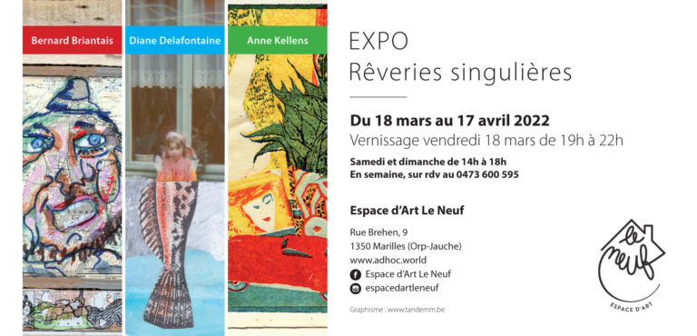 In Actualités Rêveries singulières du 18 mars au 17 avril 2022 Vernissage vendredi 18 mars de 19h à 22hSamedi et dimanche de 14h à 18hEn semaine, sur RDV au 0473 600 595Espace d’Art Le NeufRue Bremen, 91350 Marilles (Orp-Jauche)www.adhoc.world