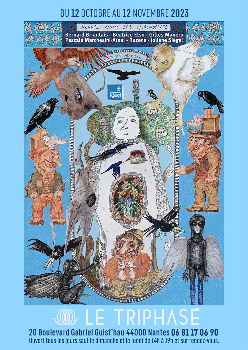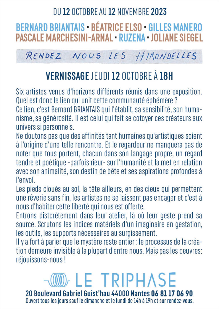 In Actualités Du 12 octobre au 12 novembre 2023 Exposition collective au Triphasé 44000 NantesBernard Briantais, Béatrice Elso, Gilles Manero, Pascale Marchesini-Arnal, Ruzena, Joliane Siegel 20 boulevard Guist’hau 44000 Nantes