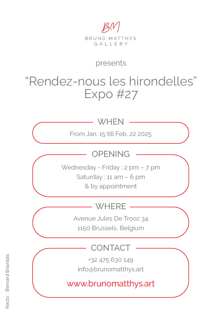 In Actualités BRUNO MATTHYS GALLERY Du 15 janvier au 22 février 2025Avenue Jules De Trooz 34 – 1150 Bruxelles. BelgiqueVernissage le mercredi 15 Janvier à partir de 17h. brunomatthys.art/www.aralya.fr/expositions/rendez-nous-les-hirondelles/