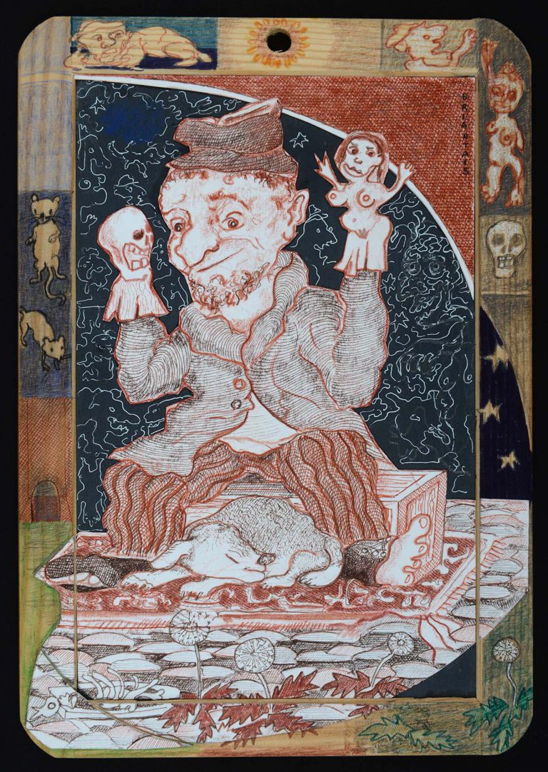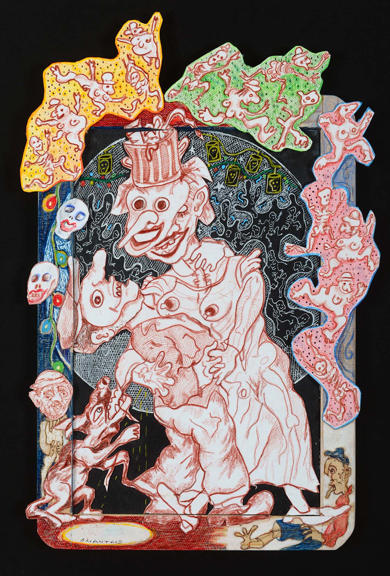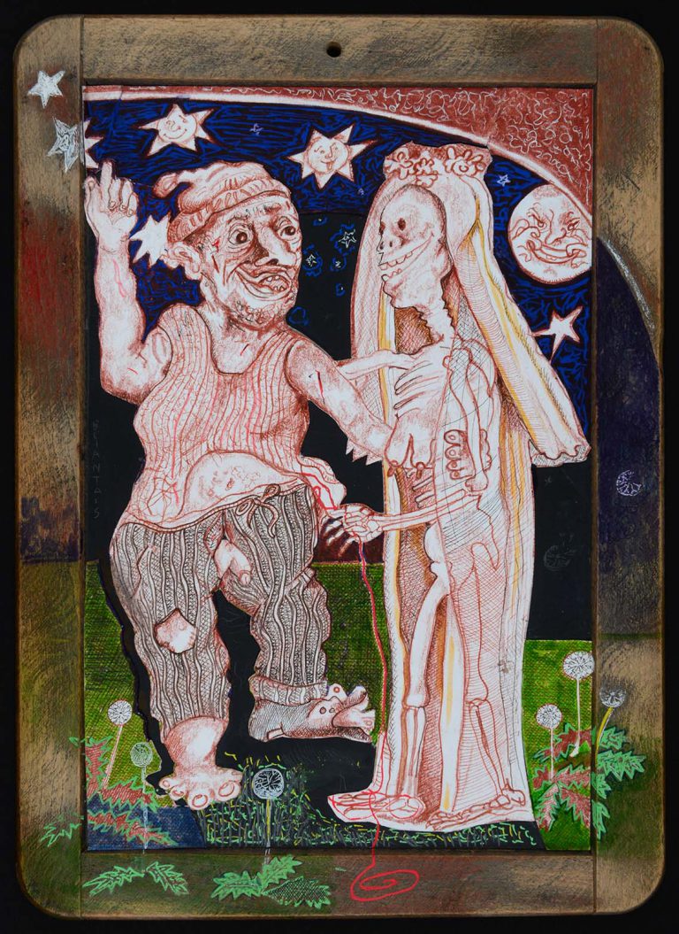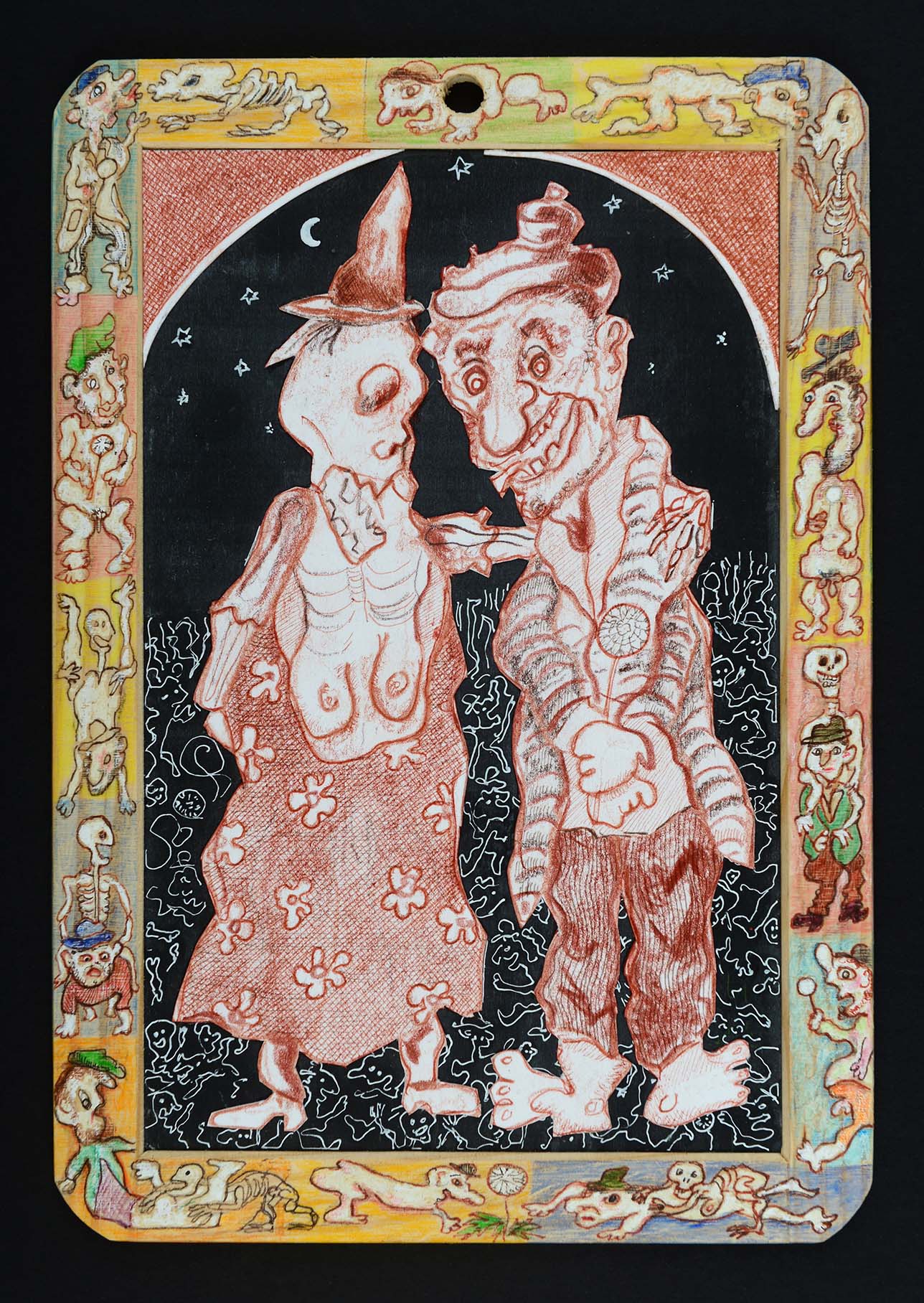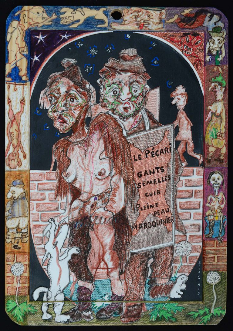 Se servant d’ardoises d’écolier et encadrant ses personnages d’enluminures à la façon des manuscrits du moyen âge, il utilise la sanguine pour exprimer la chaleur des corps et met en scène leurs festins avec la vie, leurs noces avec la mort, leurs masques et leurs numéros de funambules.