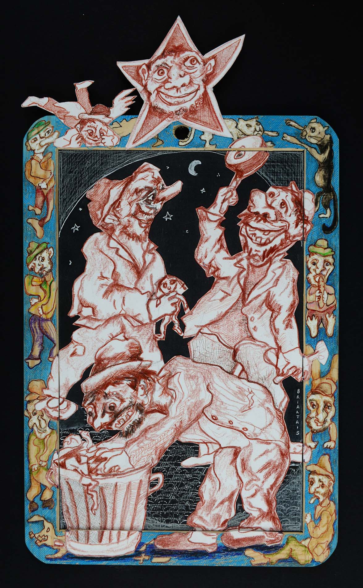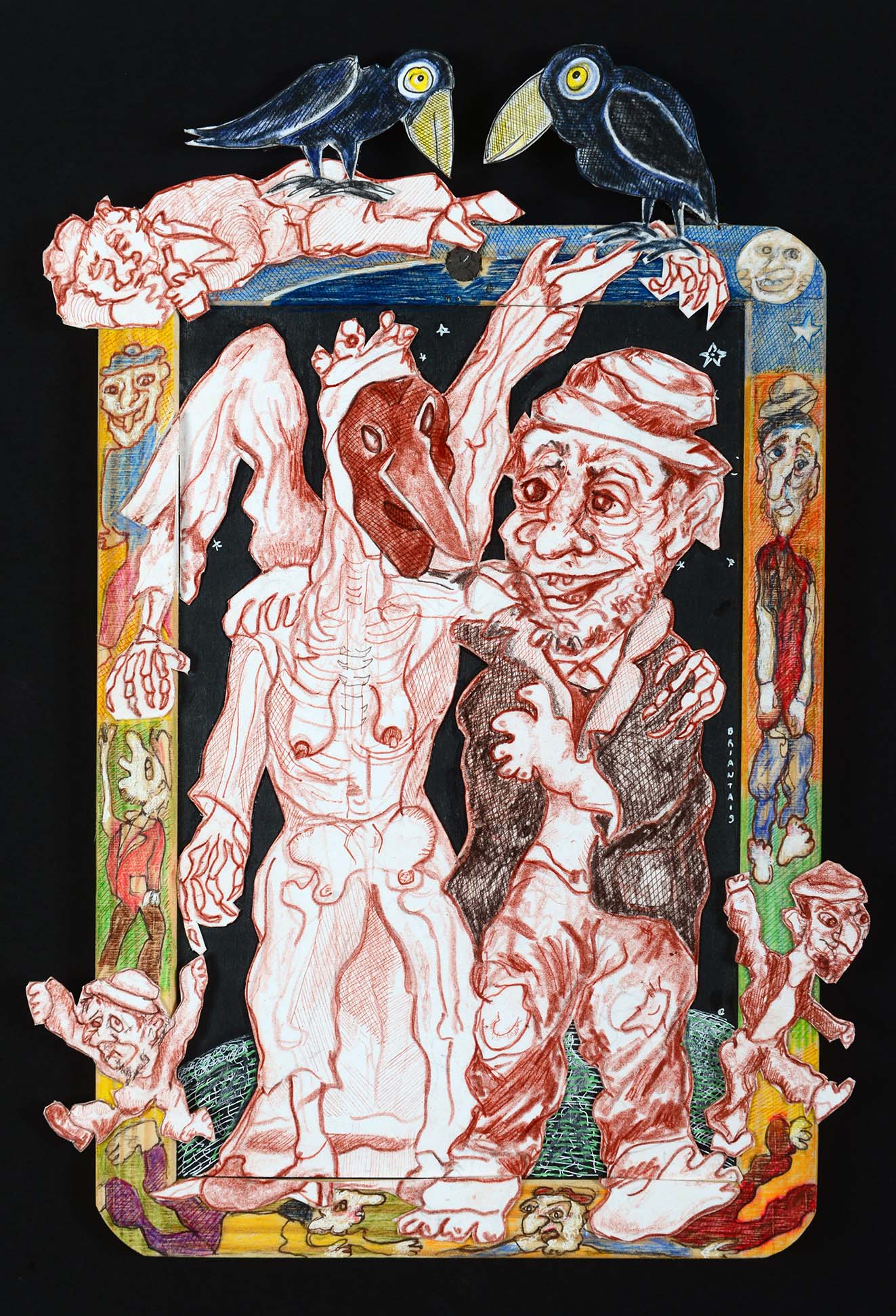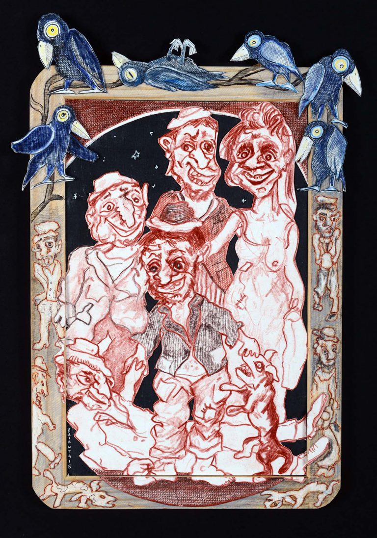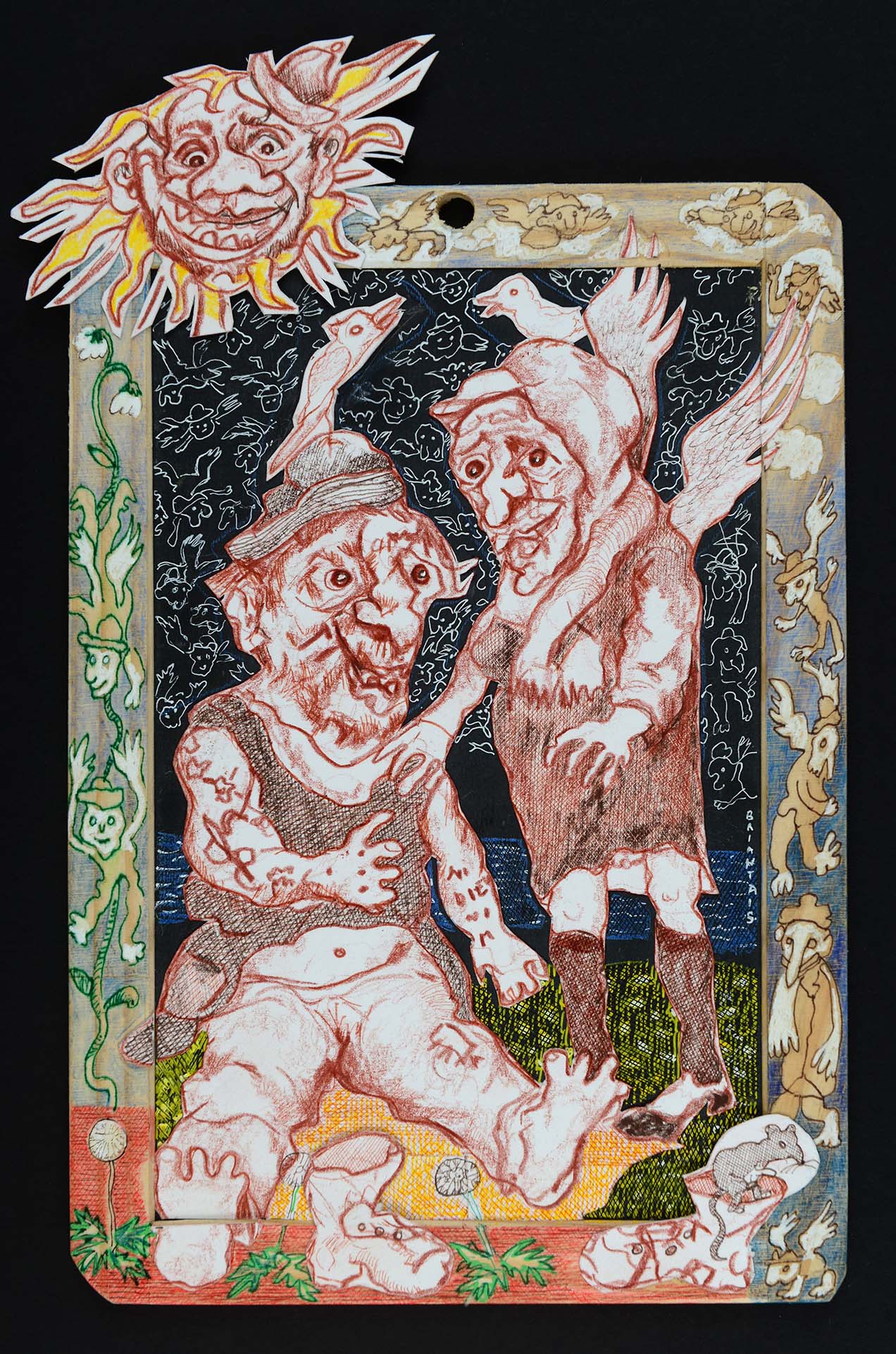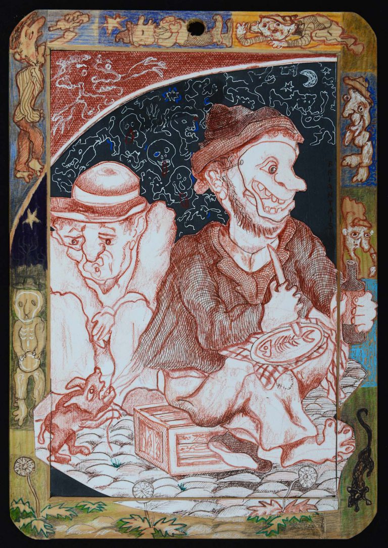 Se servant d’ardoises d’écolier et encadrant ses personnages d’enluminures à la façon des manuscrits du moyen âge, il utilise la sanguine pour exprimer la chaleur des corps et met en scène leurs festins avec la vie, leurs noces avec la mort, leurs masques et leurs numéros de funambules.