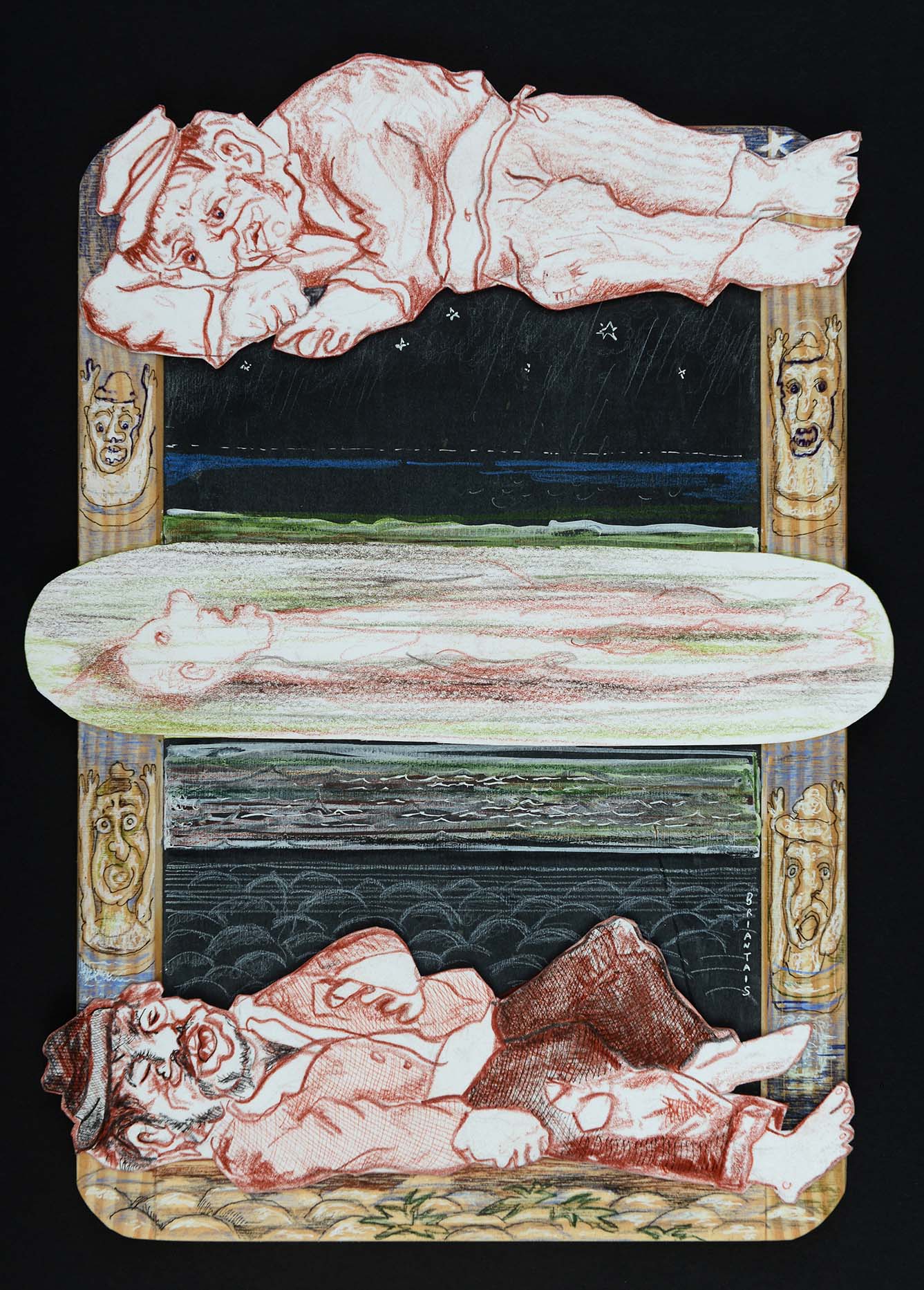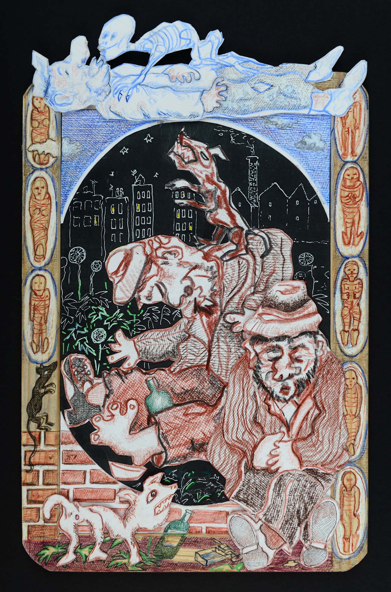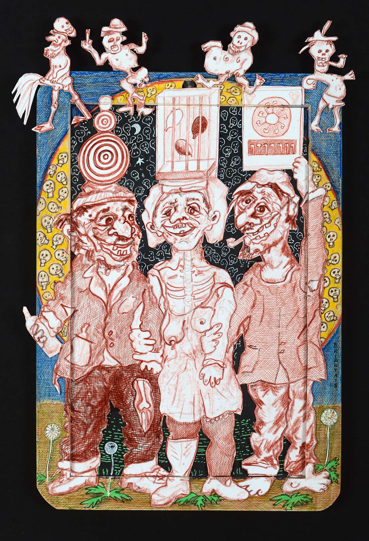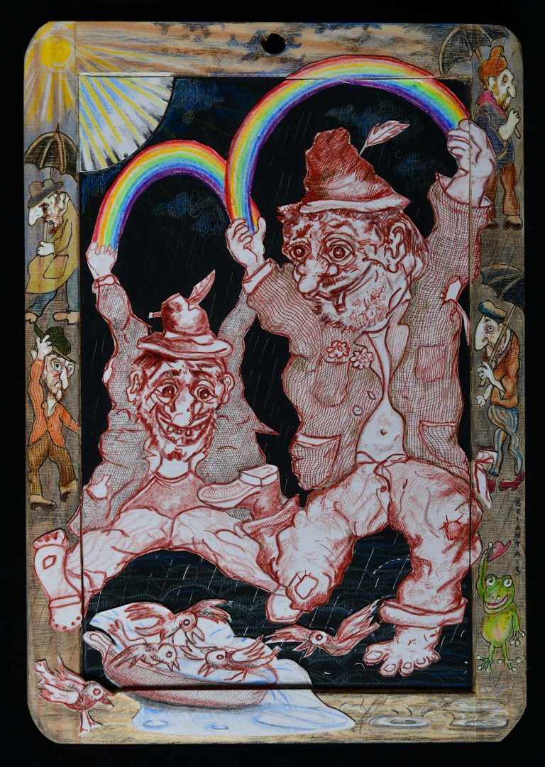 Se servant d’ardoises d’écolier et encadrant ses personnages d’enluminures à la façon des manuscrits du moyen âge, il utilise la sanguine pour exprimer la chaleur des corps et met en scène leurs festins avec la vie, leurs noces avec la mort, leurs masques et leurs numéros de funambules.