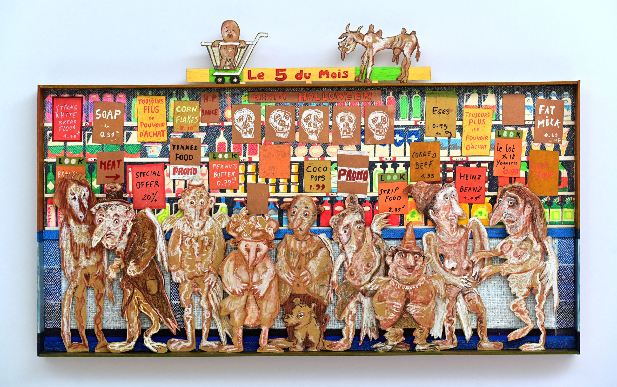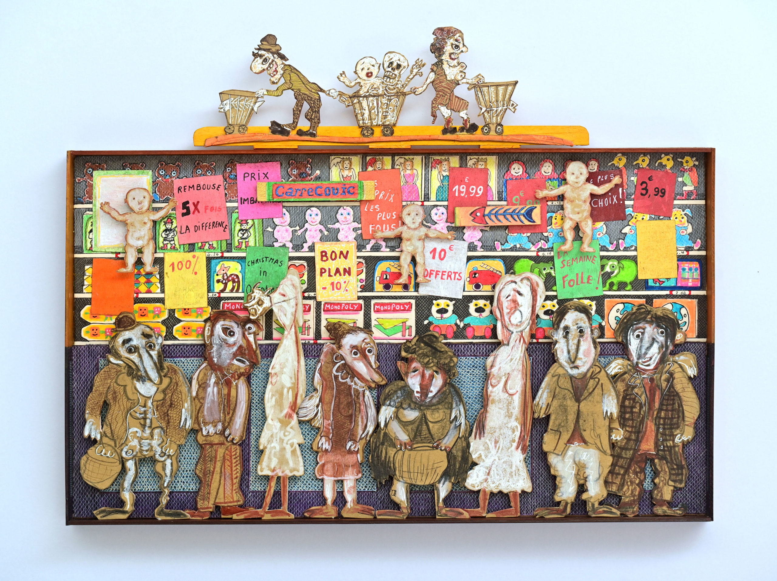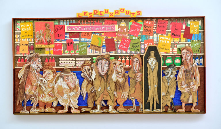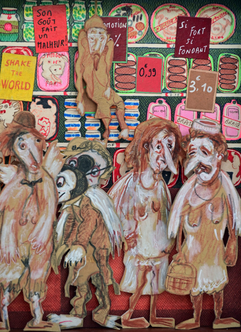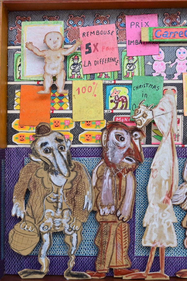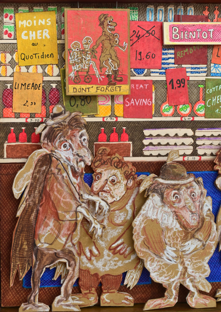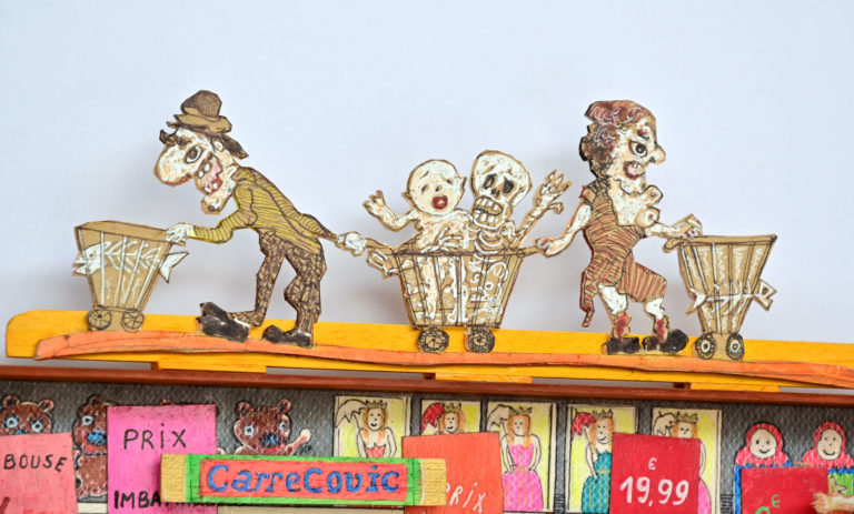 In Boites habitées, Dernières créations, Les pousseurs de caddies Au cours d’une vie, on marcherait 3800 km derrière un caddy (d’où, sans doute, le nom de supermarché).Ça en fait du chemin dans l’autre sens si on a oublié le beurre.Hervé Le Tellier