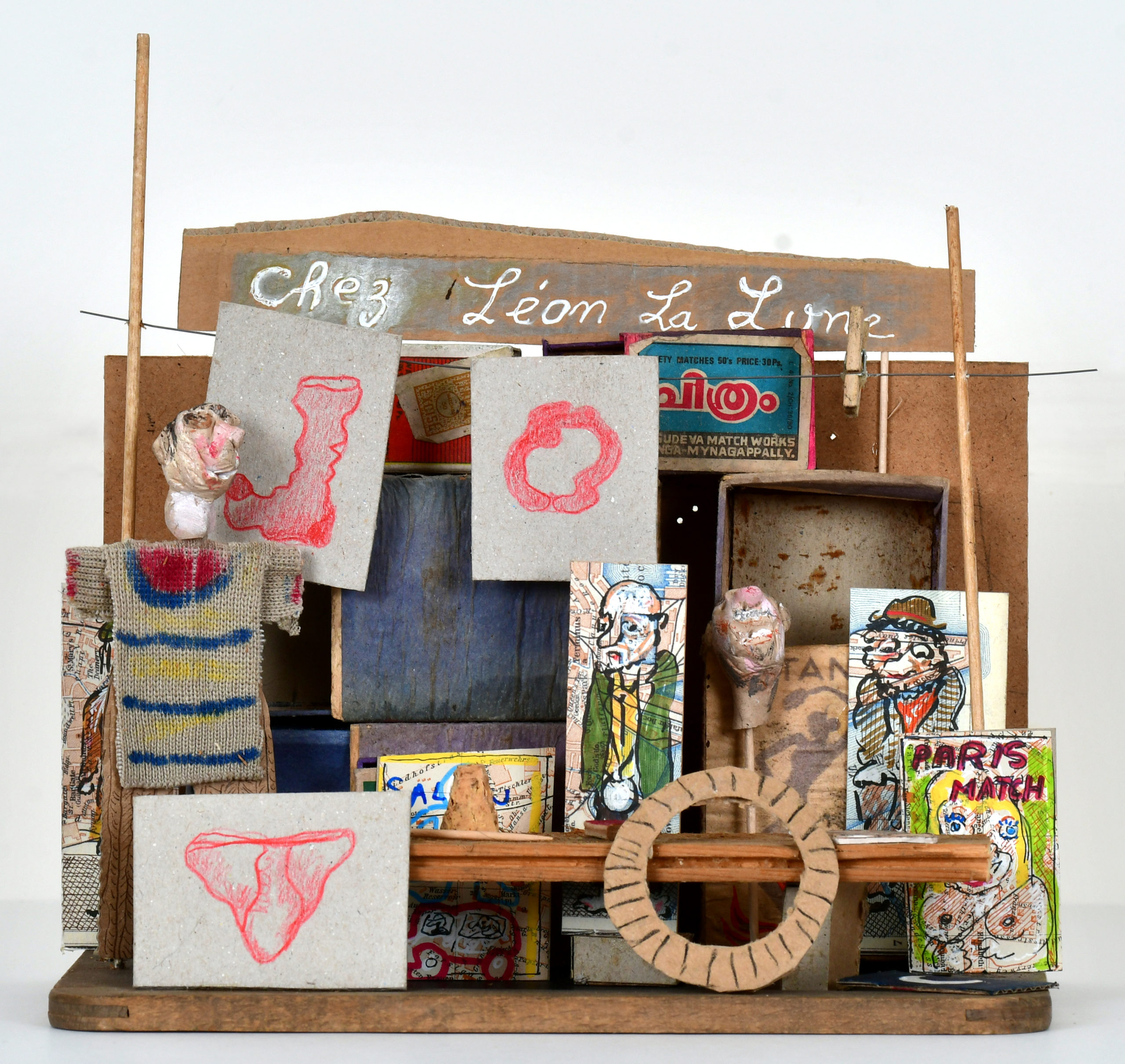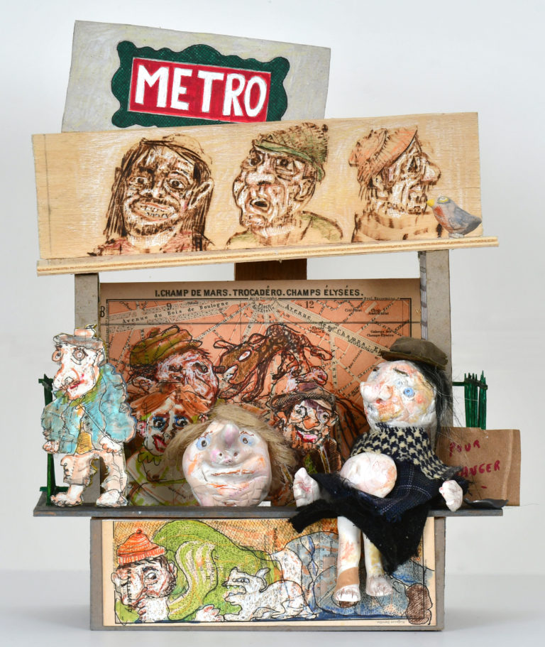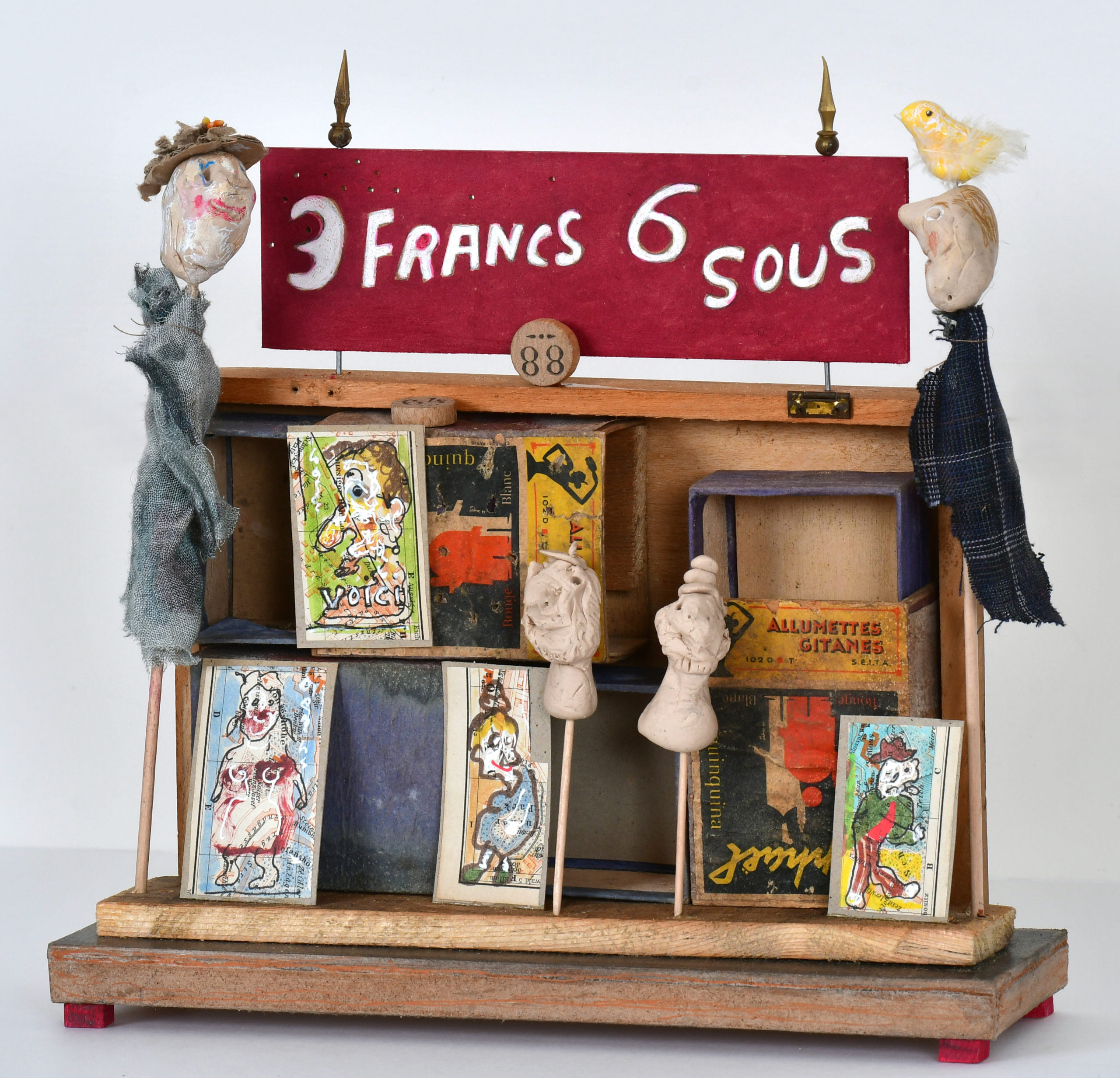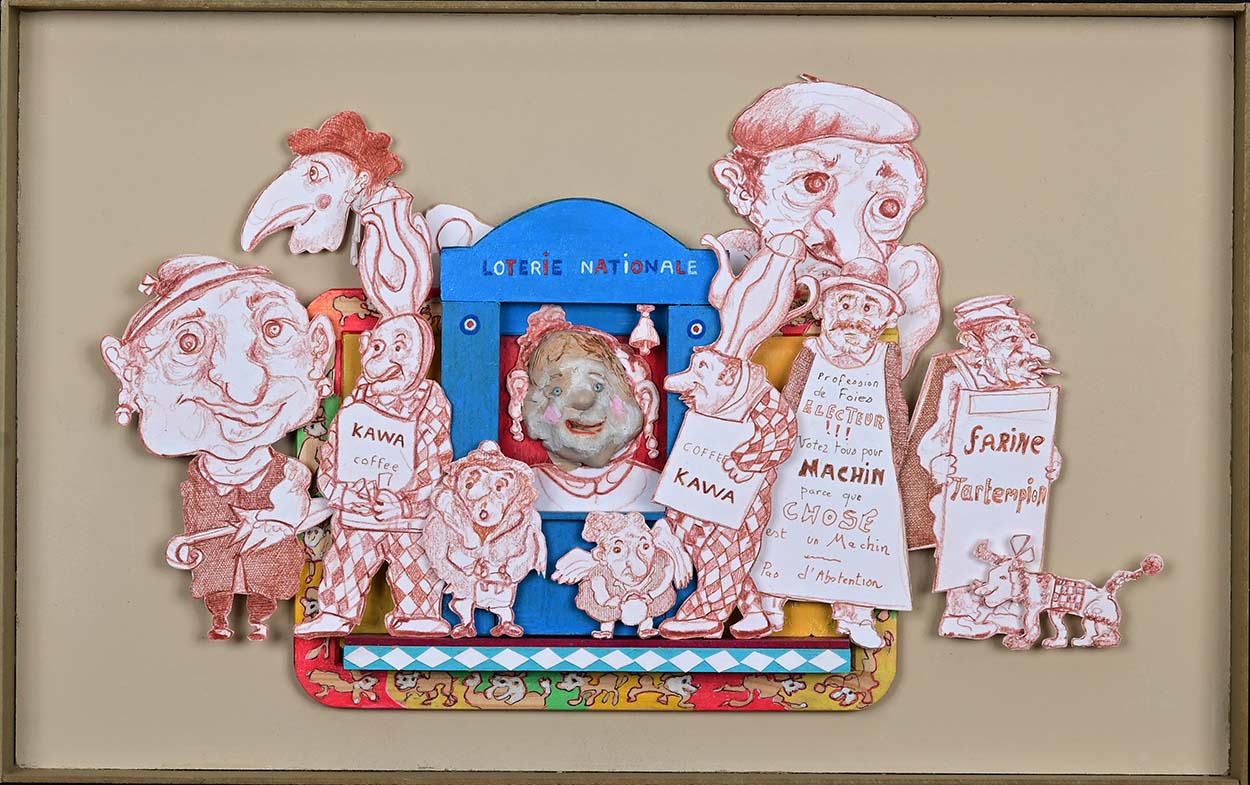In Boites habitées, De bric et de broc, Dernières créations Je me suis toujours méfié de la profusion de moyens : belles couleurs, beaux papiers, etc…Toutes mes réalisations sont comme un éloge de la contrainte. C’est dans le dénuement, la banalité des matériaux que se trouve aussi la solution à la création. 5- La petite dame de la loterie