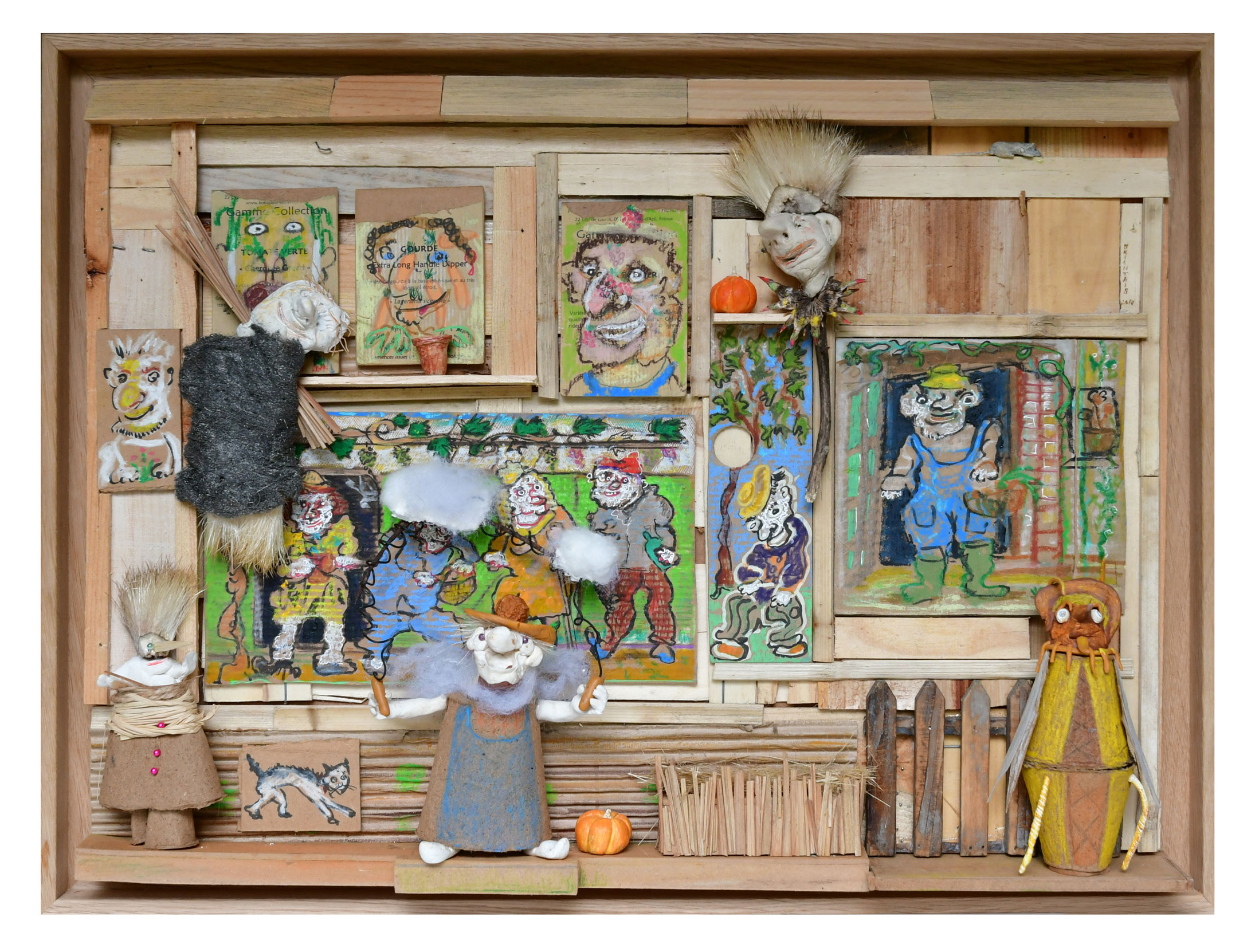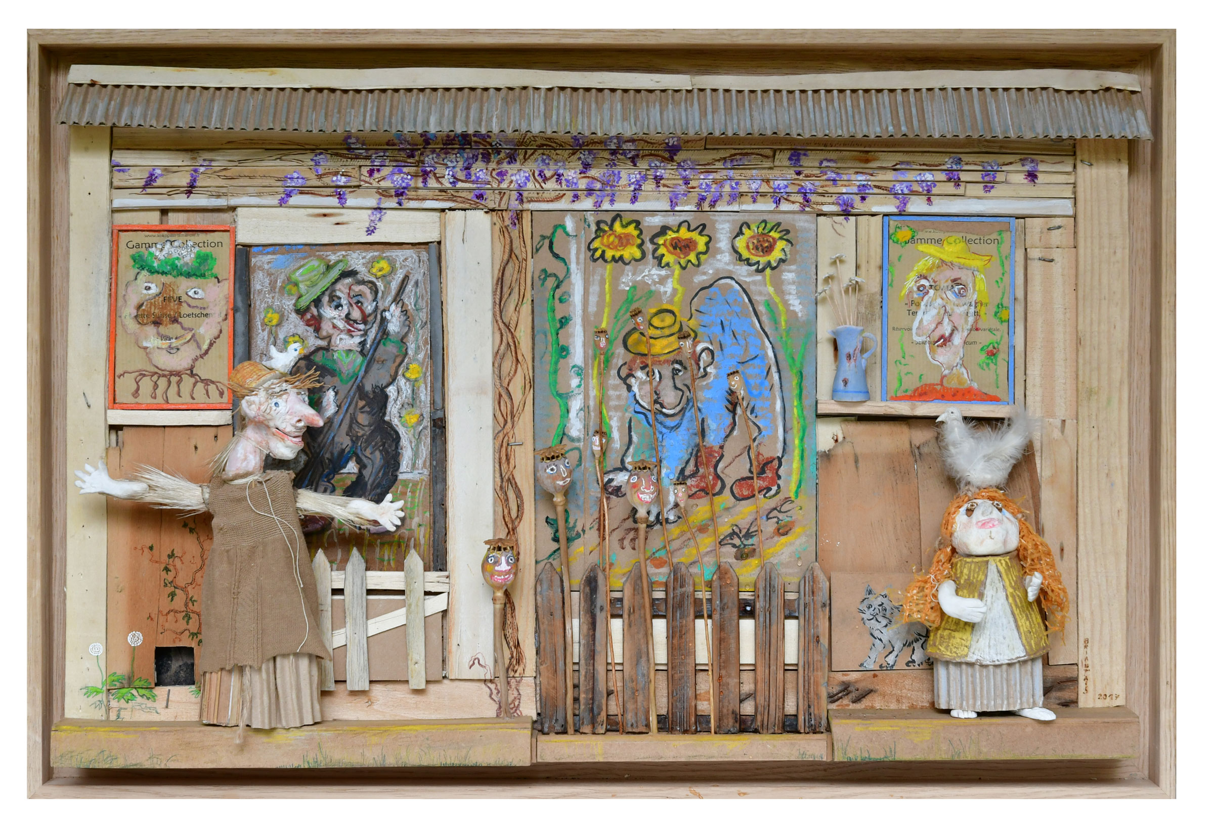 Ce qui s’offre à notre regard ce sont des êtres étranges, (humains, animaux, humanimaux) qui tentent de nous interpeller depuis un petit théâtre bucolique, fait d’un bric-à-brac poétique et insolite. Sur fond de portraits d’humbles jardiniers, c’est tout un bestiaire cocasse, fabuleux et singulier qui vient nous saluer. Bernard Briantais aime la pauvreté des matériaux, il choisit de travailler avec trois fois rien. De ce « trois fois rien » il en fait une ode à l’exubérance de la nature et un pied de nez à la normalité.