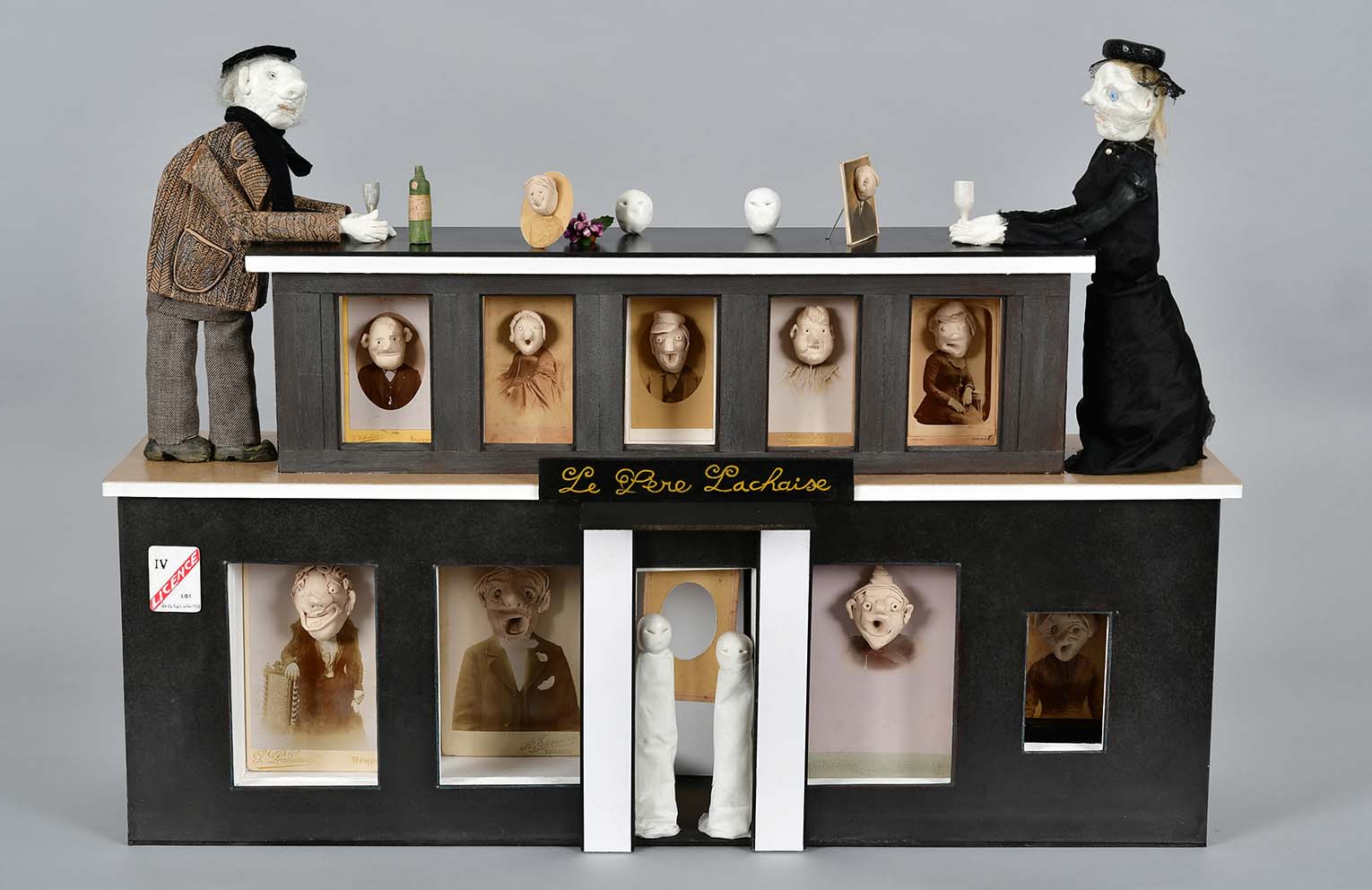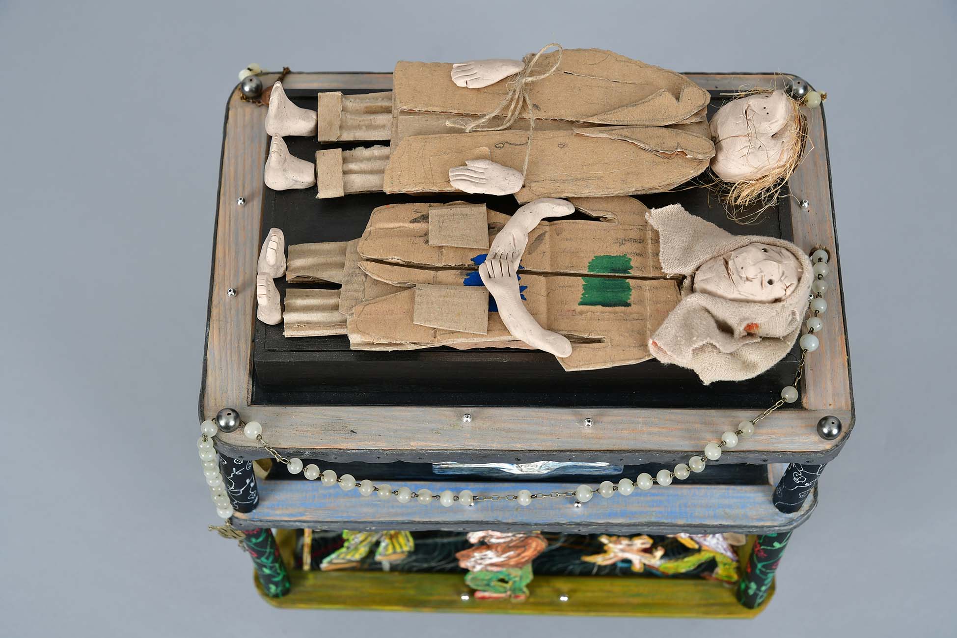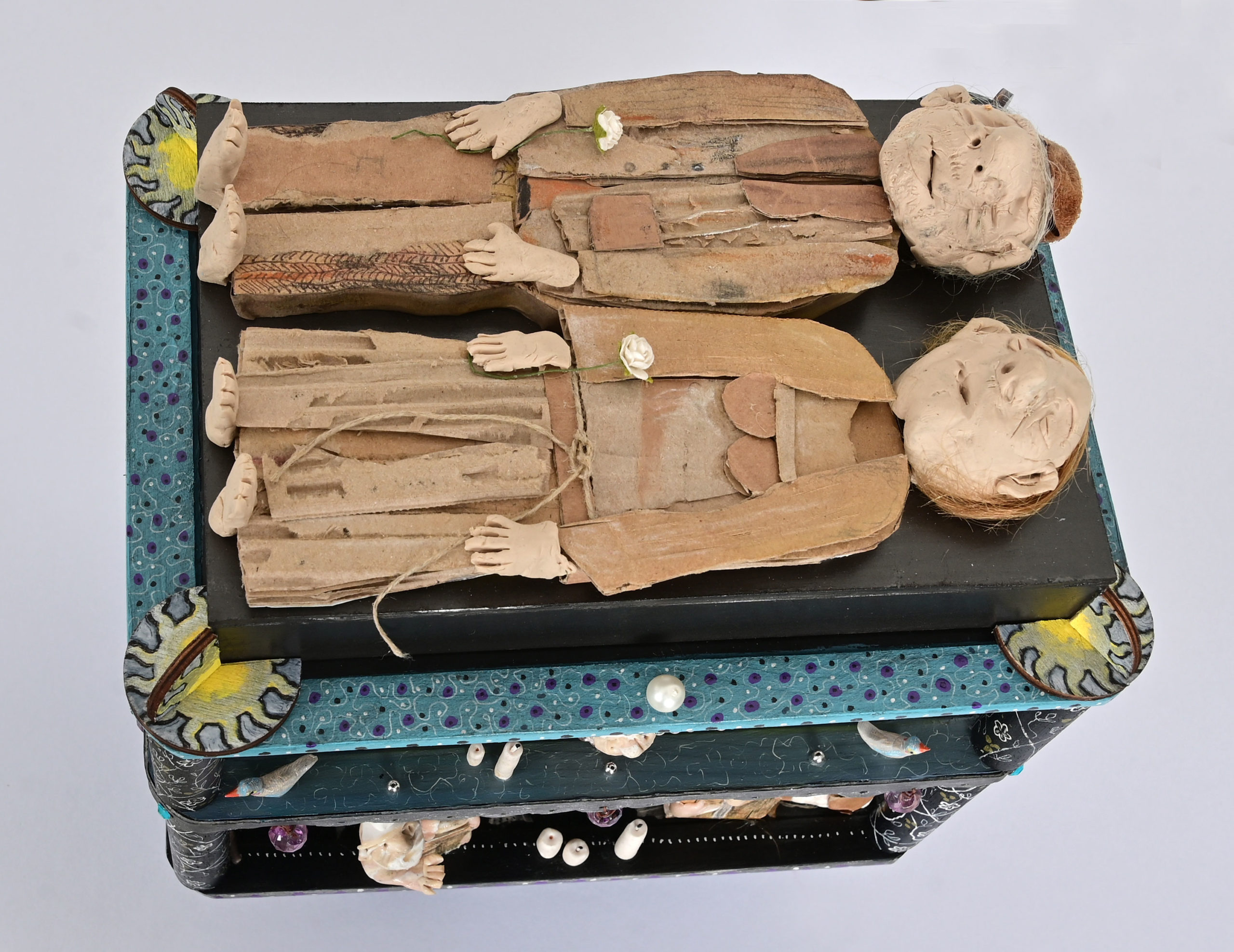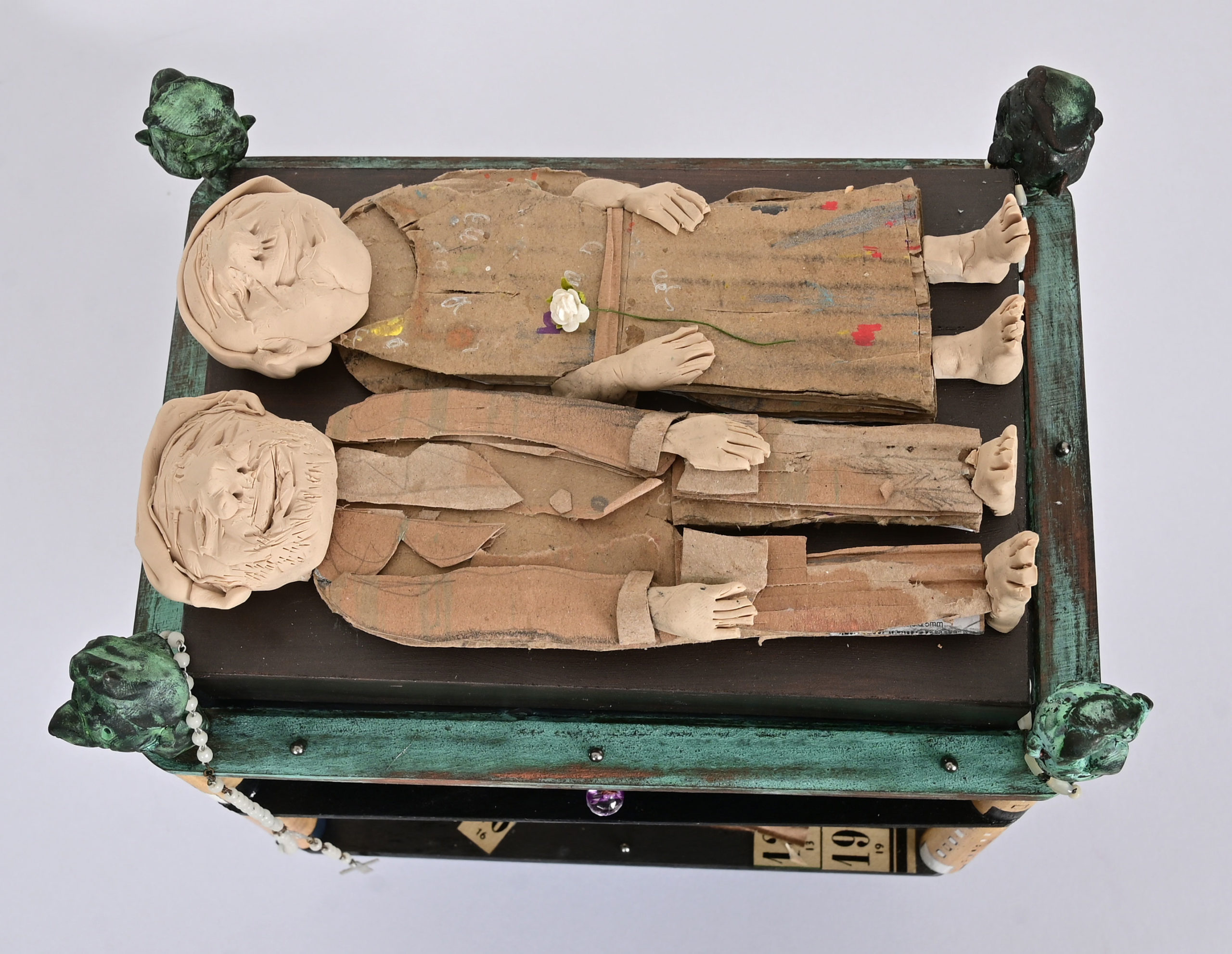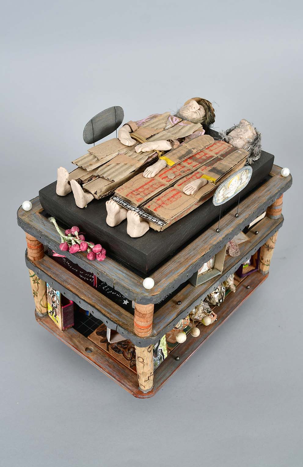 Tombeaux des traîne-misère : gisants sur la froide ardoise, ils reposent deux par deux, compagnons et compagnes d’infortune, placés au-dessus d’un cénotaphe, restitution de leur vie de cartons.