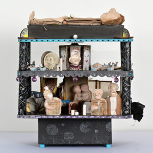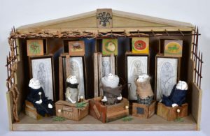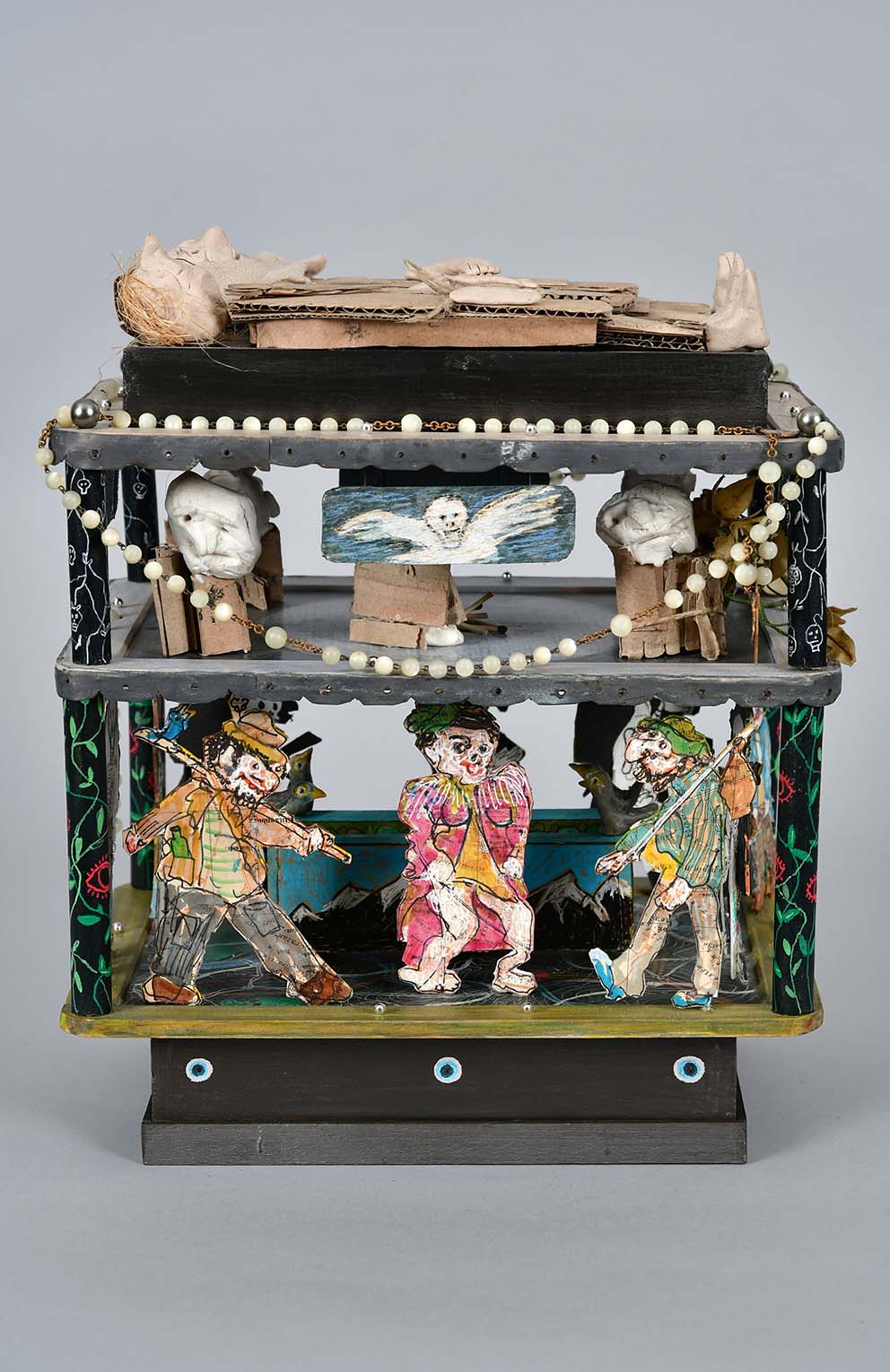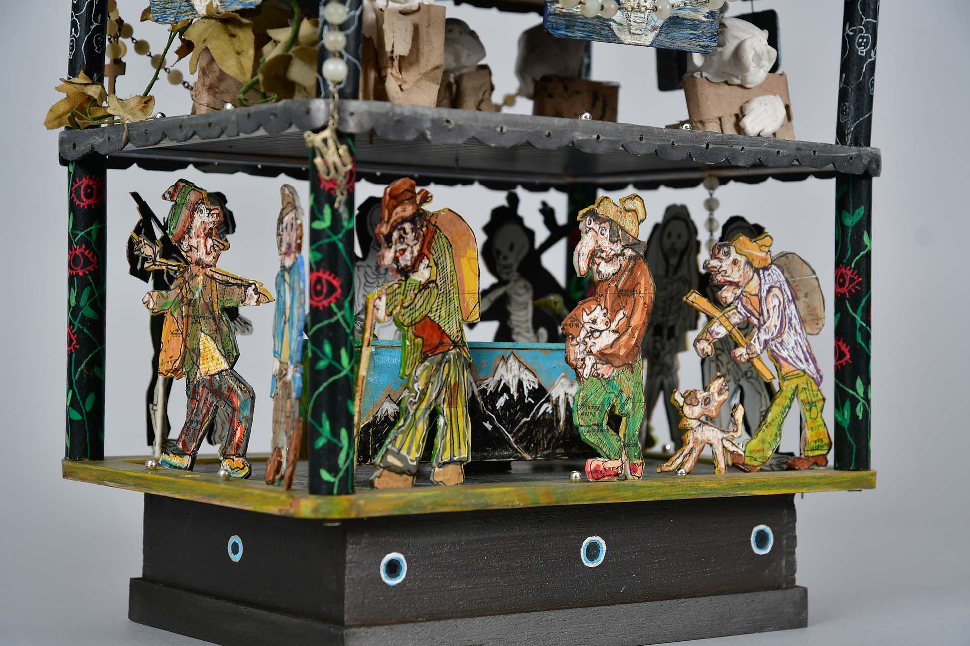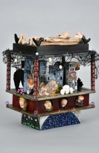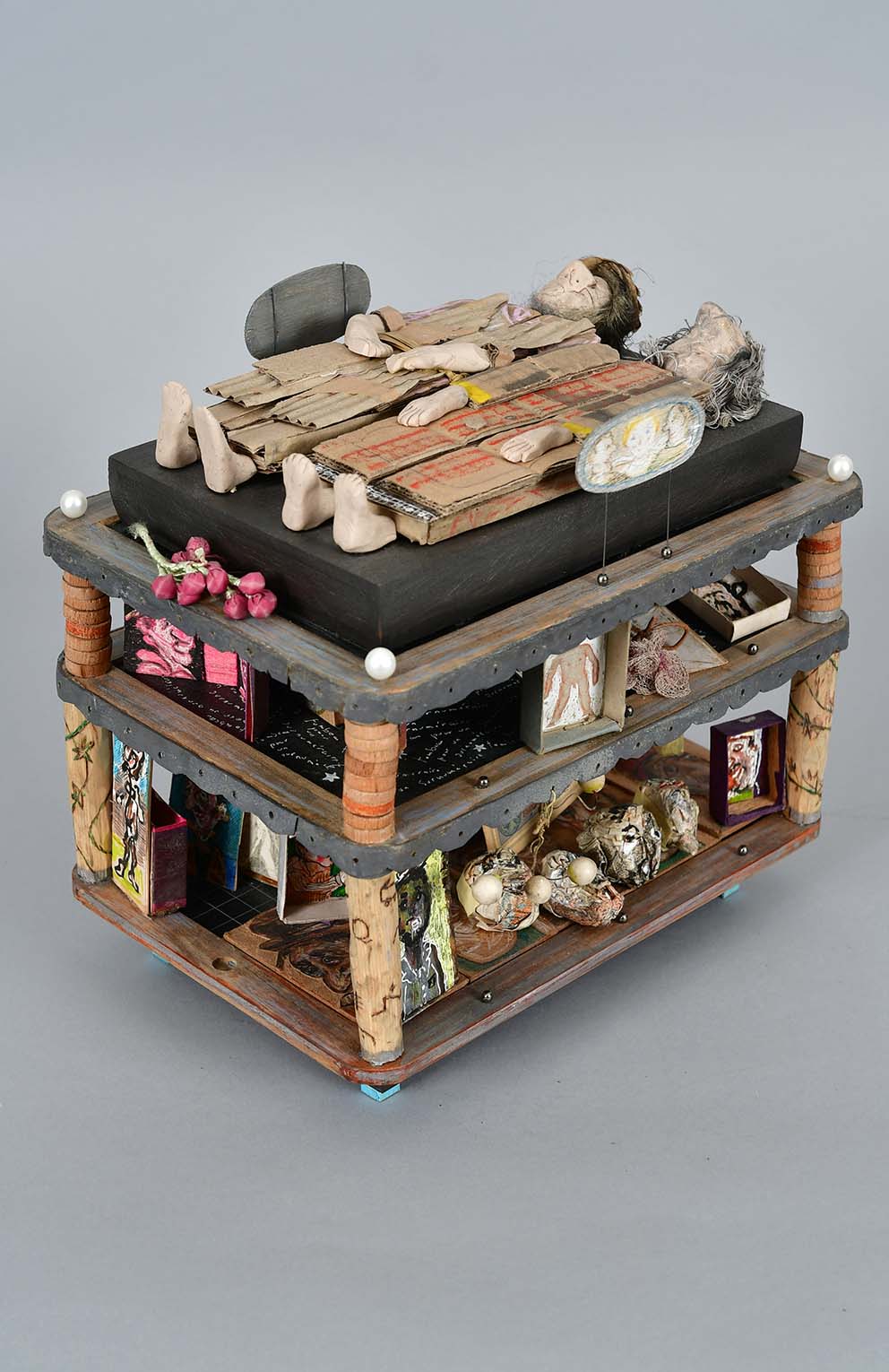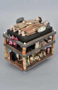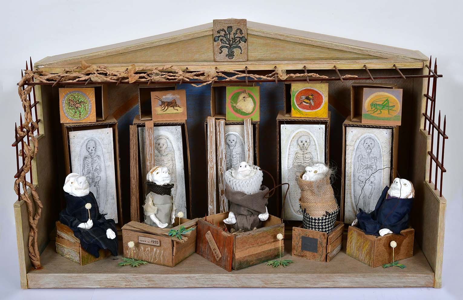 Tombeaux des traîne-misère : gisants sur la froide ardoise, ils reposent deux par deux, compagnons et compagnes d’infortune, placés au-dessus d’un cénotaphe, restitution de leur vie de cartons.